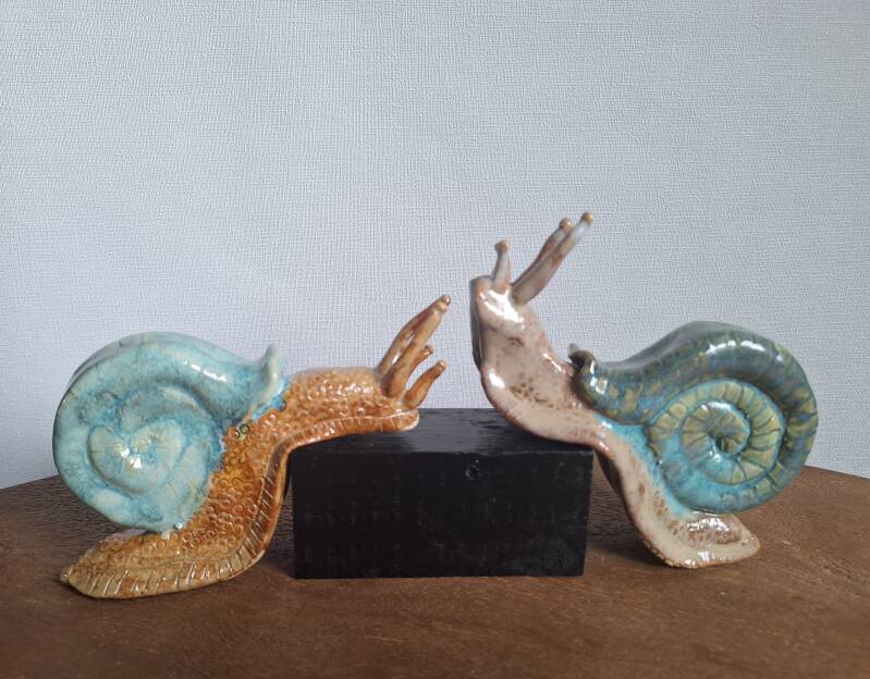 Elke slak heeft een unieke vorm en een eigen glazuurlaag, van een glanzend blauw slakkenhuis tot de subtiel gespikkelde naaktslakken.
